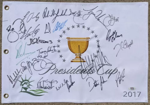 2017 PRESIDENTS CUP MULTI SIGNED GOLF FLAG TIGER WOODS, DONALD TRUMP ++ PSA/DNA COLLECTIBLE MEMORABILIA