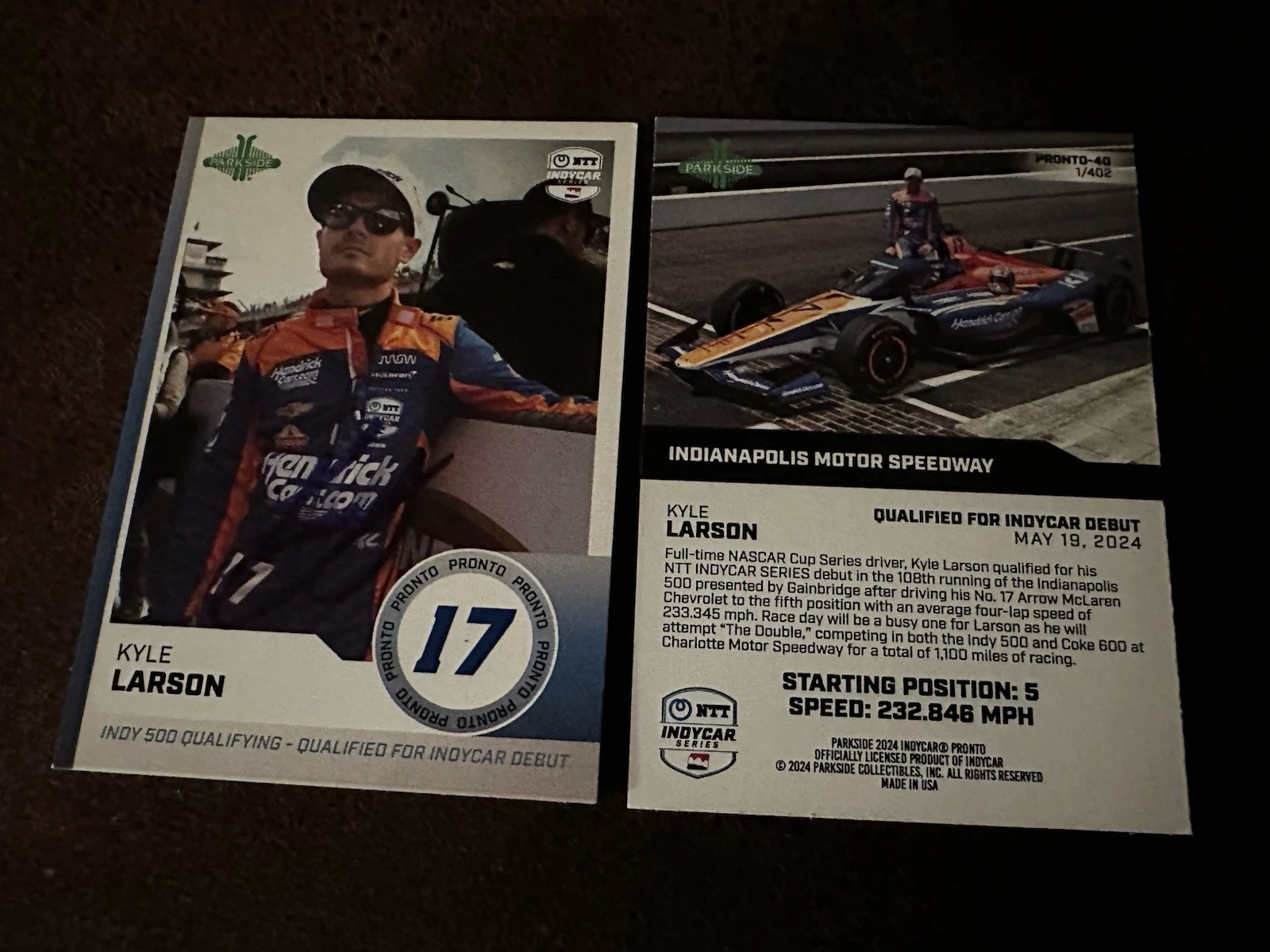 2024 PARKSIDE PRONTO INDY CAR FIRST TRADING CARD 500 SIGNED KYLE LARSON RC INDY COLLECTIBLE MEMORABILIA