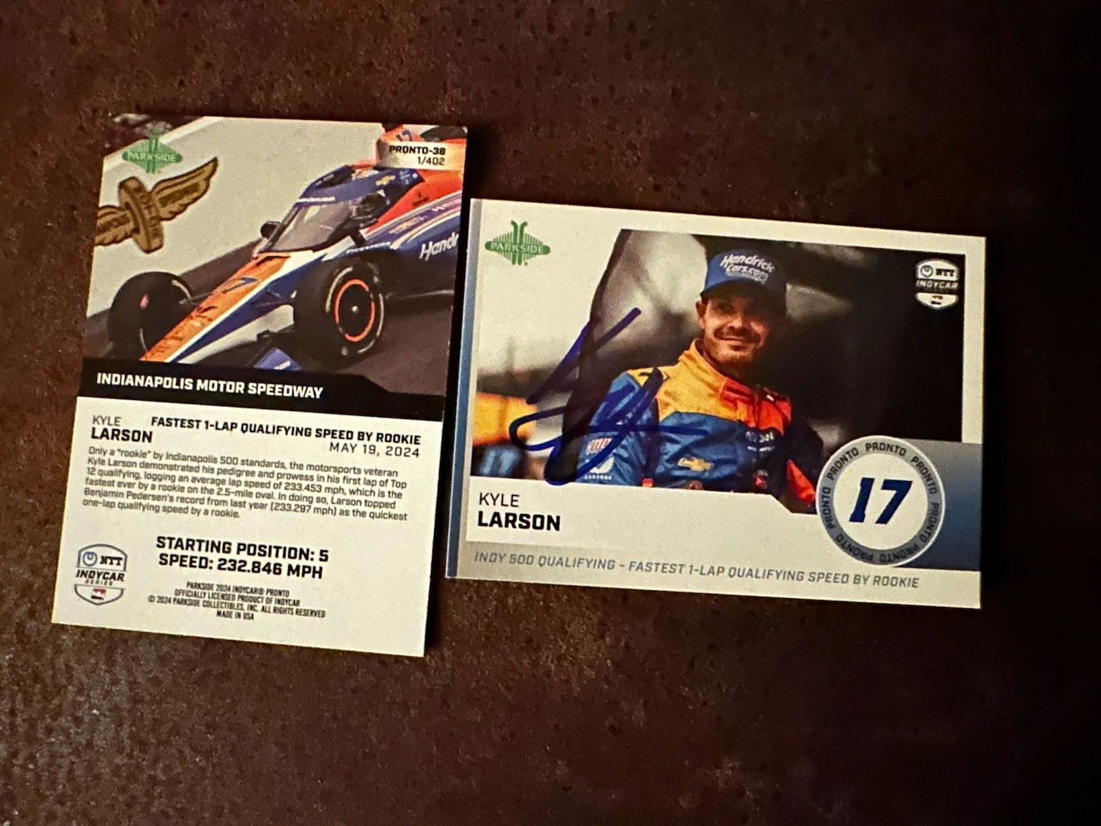 2024 PARKSIDE PRONTO INDY CAR FIRST TRADING CARD 500 SIGNED KYLE LARSON RC INDY COLLECTIBLE MEMORABILIA