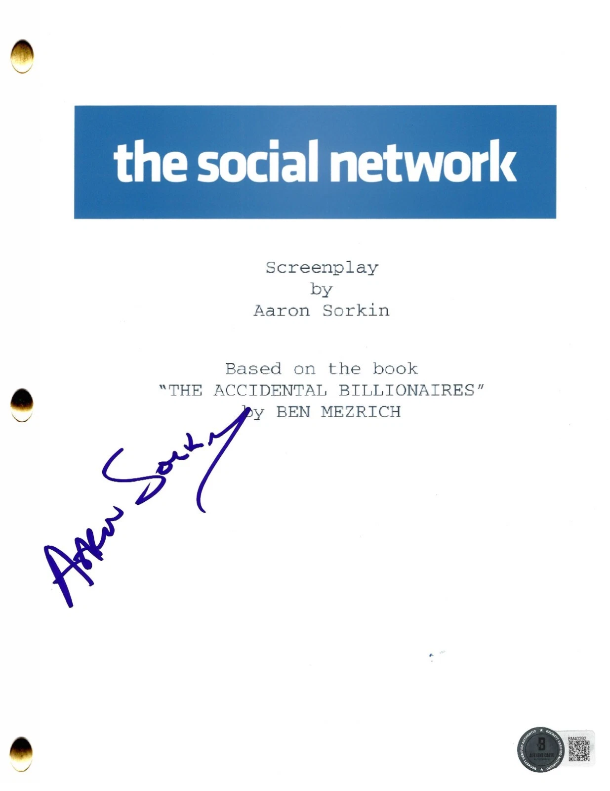 AARON SORKIN SIGNED THE SOCIAL NETWORK SCRIPT AUTHENTIC AUTOGRAPH BECKETT COLLECTIBLE MEMORABILIA