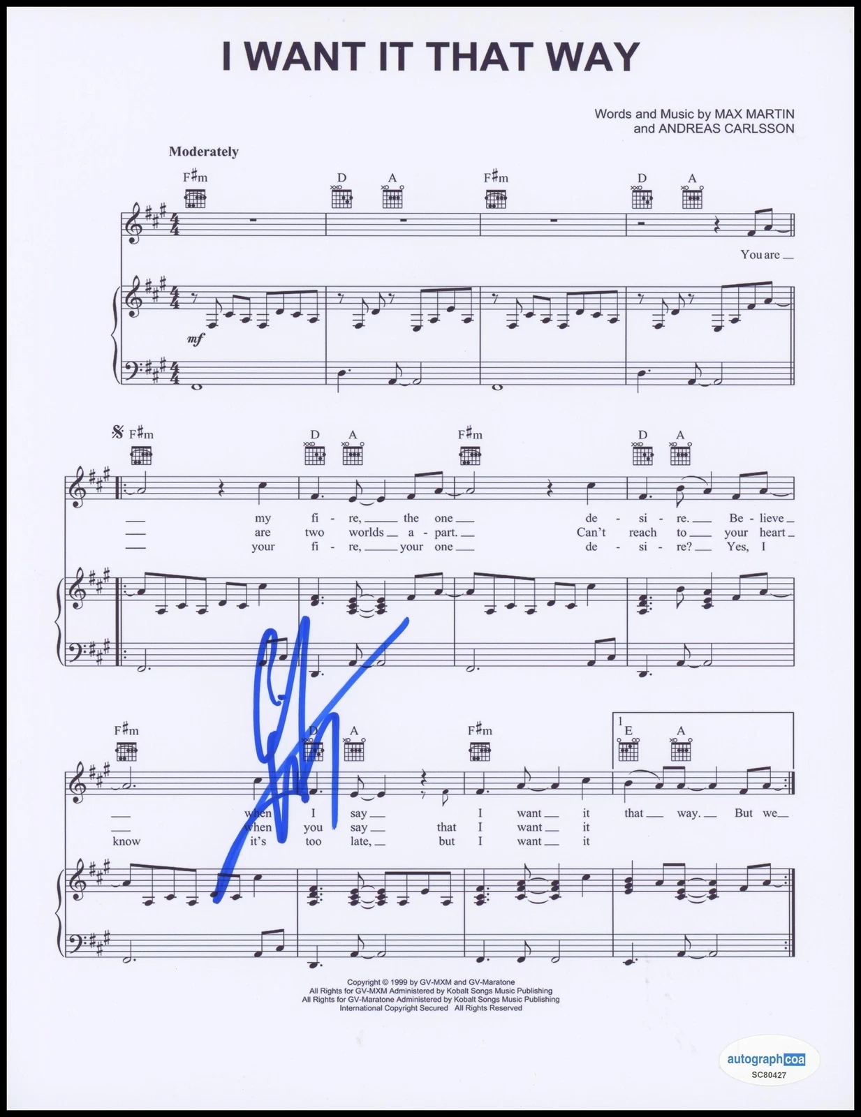 AJ MCLEAN “BACKSTREET BOYS” AUTOGRAPH SIGNED ‘I WANT IT THAT WAY’ SHEET MUSIC COLLECTIBLE MEMORABILIA