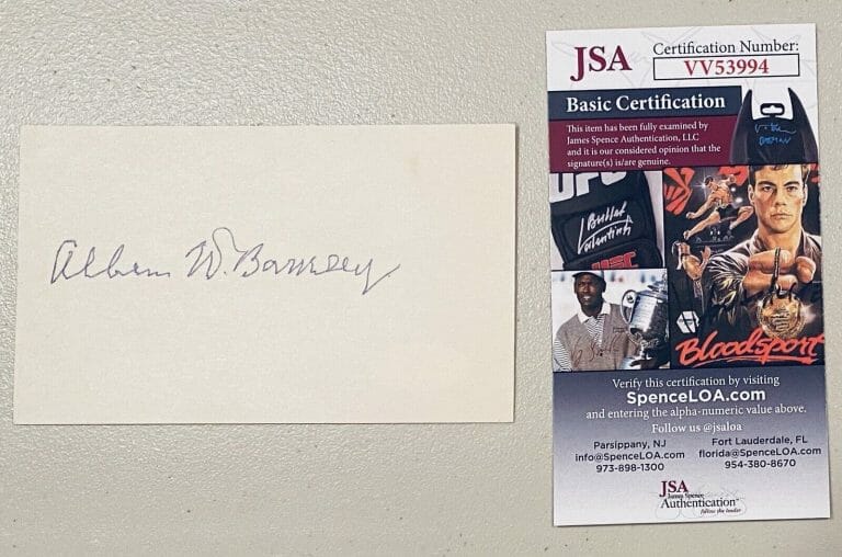 ALBEN BARKLEY SIGNED AUTOGRAPHED 3×5 CARD JSA CERT HARRY TRUMAN VICE PRESIDENT COLLECTIBLE MEMORABILIA