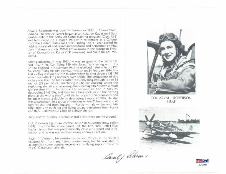 ARVAL ROBERSON SIGNED 8X10 (D) PSA DNA AC42291 WWII ACE 6.5 KILLS COLLECTIBLE MEMORABILIA