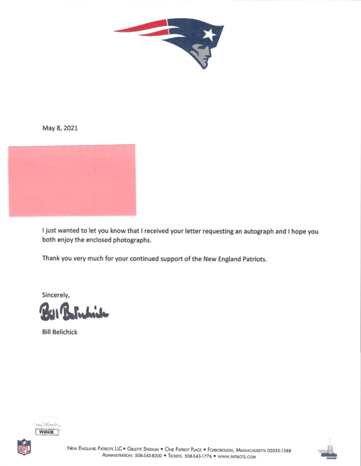 BILL BELICHICK HAND SIGNED 2021 LETTER ON PATRIOTS LETTERHEAD JSA COLLECTIBLE MEMORABILIA