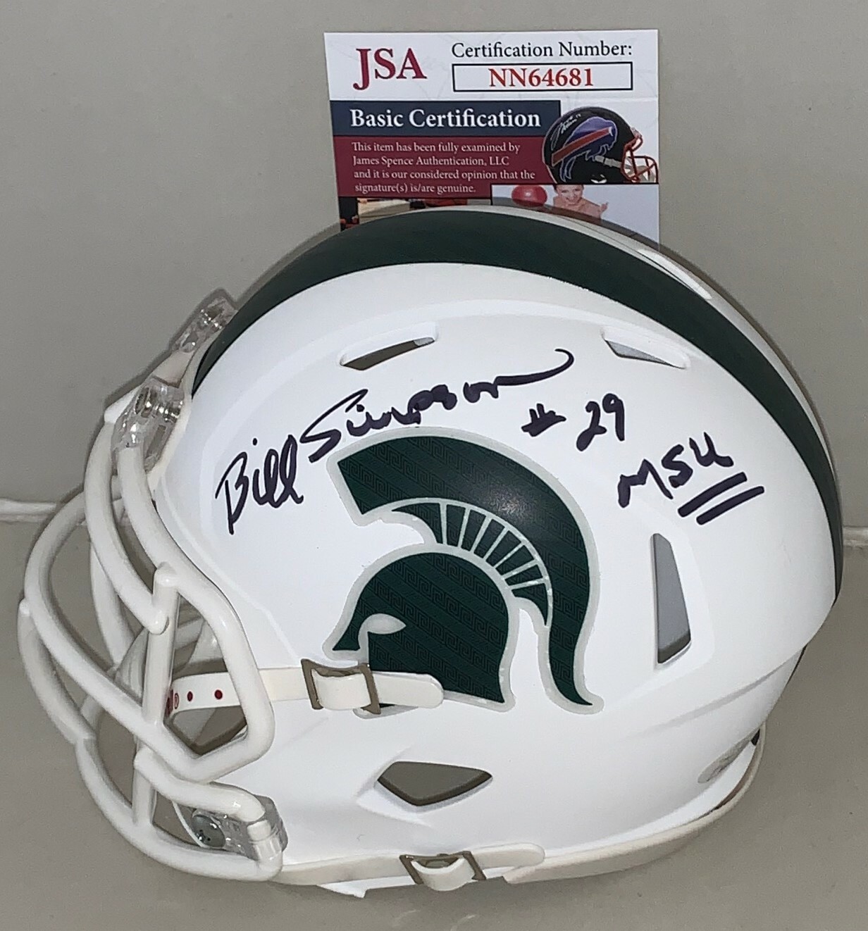 BILL SIMPSON SIGNED MICHIGAN STATE SPARTANS WHITE MINI HELMET AUTOGRAPHED JSA COLLECTIBLE MEMORABILIA