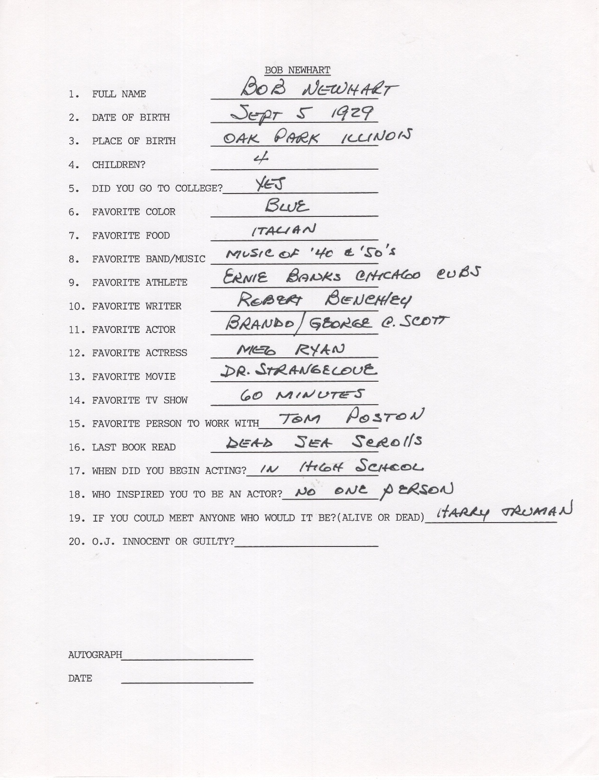 BOB NEWHART HAND SIGNED+FILLED OUT 20 QUESTIONS+COA HOLLYWOOD LEGEND COLLECTIBLE MEMORABILIA