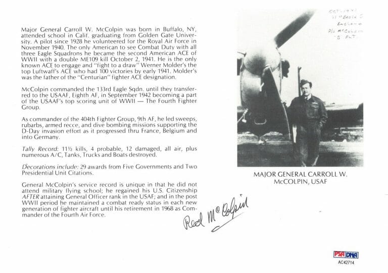 CARROLL MCCOLPIN SIGNED 8X10 (D) PSA DNA AC42714 WWII ACE 11.5 KILLS COLLECTIBLE MEMORABILIA