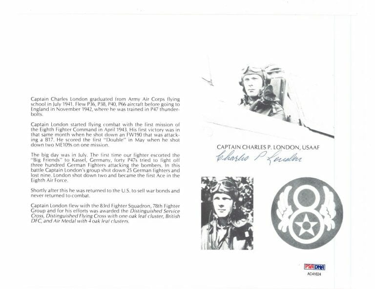 CHARLES LONDON SIGNED 8X10 (D) PSA DNA AC41624 WWII ACE 5 KILLS 1ST 8TH AF ACE COLLECTIBLE MEMORABILIA
