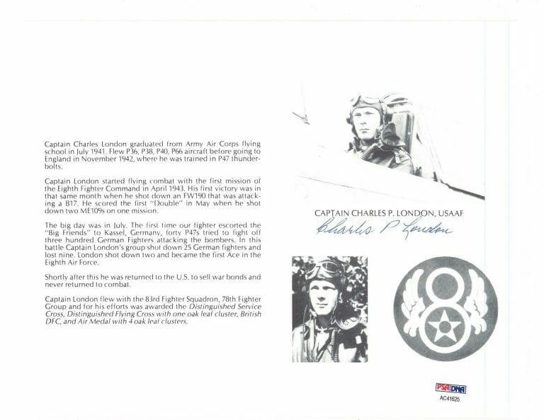 CHARLES LONDON SIGNED 8X10 (D) PSA DNA AC41625 WWII ACE 5 KILLS 1ST 8TH AF ACE COLLECTIBLE MEMORABILIA