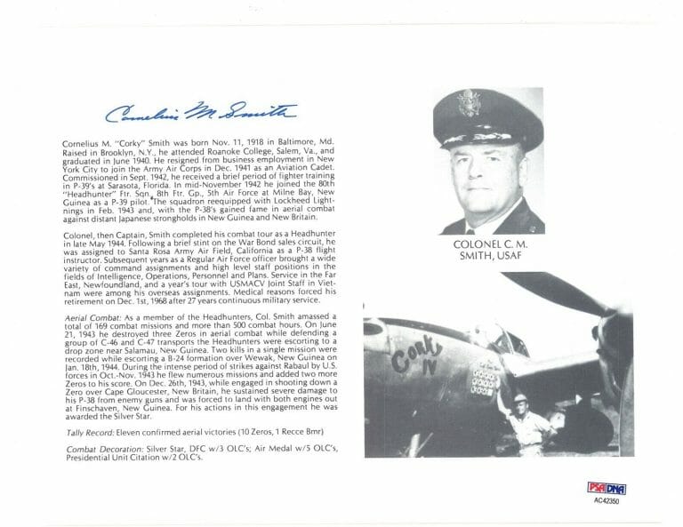 CORNELIUS CORKY SMITH SIGNED 8X10 (D) PSA DNA AC42350 WWII ACE 11 KILLS COLLECTIBLE MEMORABILIA