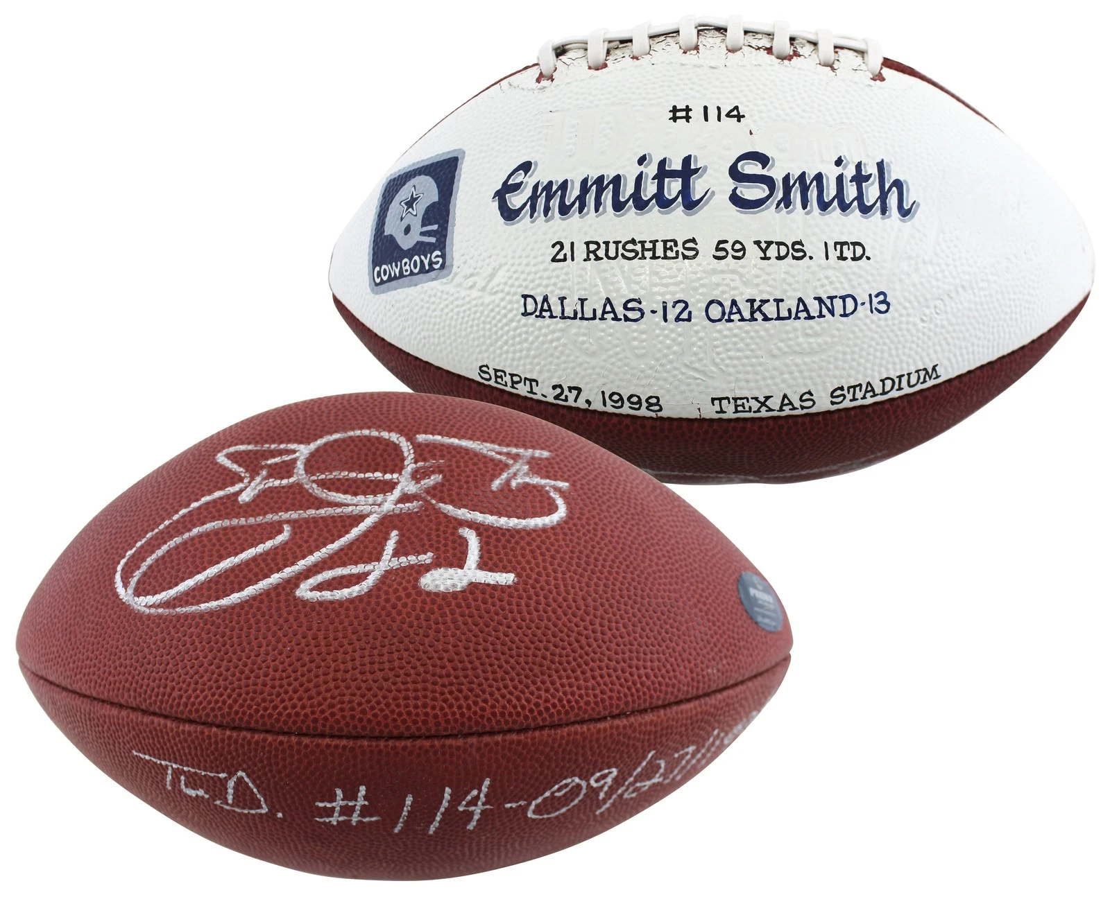 COWBOYS EMMITT SMITH “TD #114 – 09/27/1998” SIGNED GU FOOTBALL BAS & PROVA LOA COLLECTIBLE MEMORABILIA