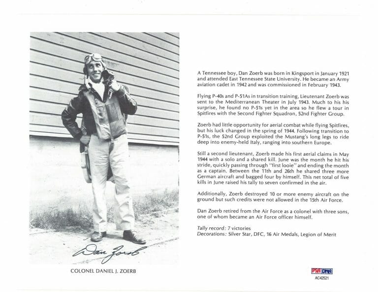 DANIEL ZOERB SIGNED 8X10 (D) PSA DNA AC42521 WWII ACE 7 KILLS COLLECTIBLE MEMORABILIA