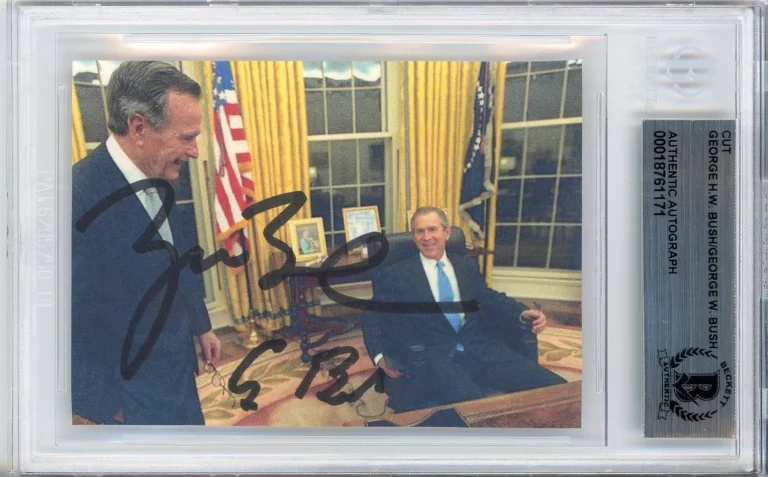DUAL SIGNED PRESIDENT GEORGE W & HW BUSH OVAL OFFICE PICTURE CUT BECKETT BAS COA COLLECTIBLE MEMORABILIA