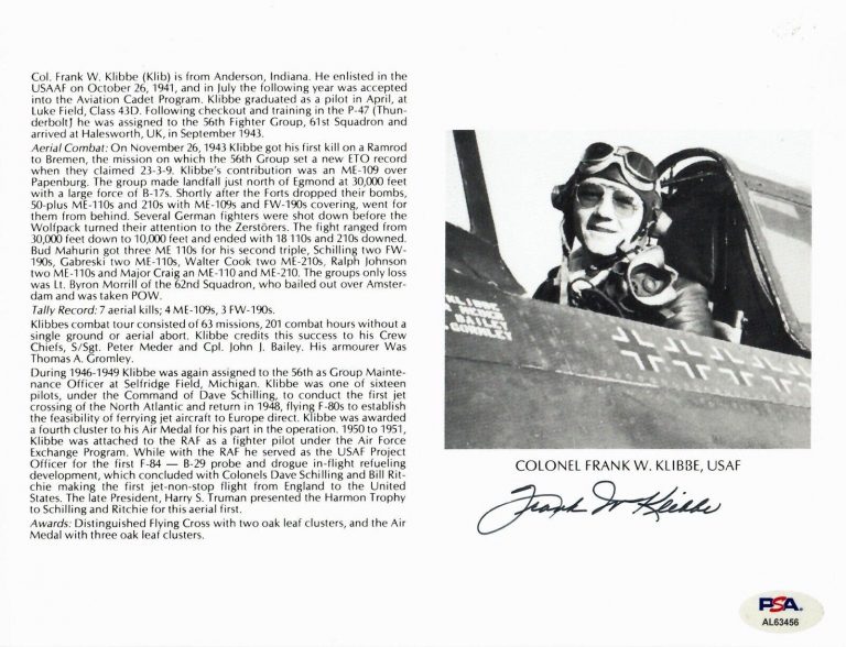 FRANK KLIBBE SIGNED 8X10 (D) PSA DNA AL63456 WWII ACE 7 KILLS COLLECTIBLE MEMORABILIA