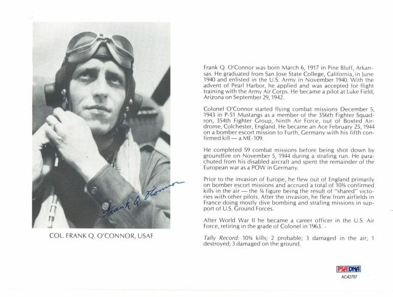 FRANK O’CONNOR SIGNED 8X10 (D) PSA DNA AC42797 WWII ACE 10.75 KILLS COLLECTIBLE MEMORABILIA