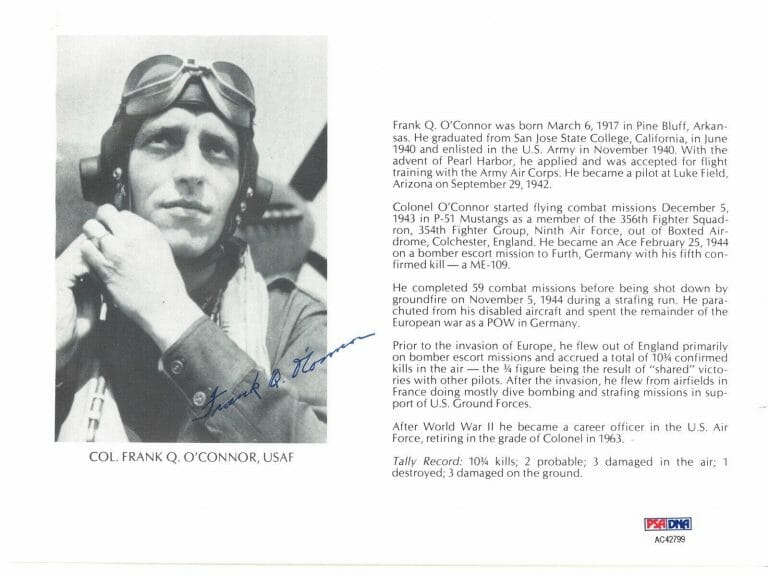 FRANK O’CONNOR SIGNED 8X10 (D) PSA DNA AC42799 WWII ACE 10.75 KILLS COLLECTIBLE MEMORABILIA