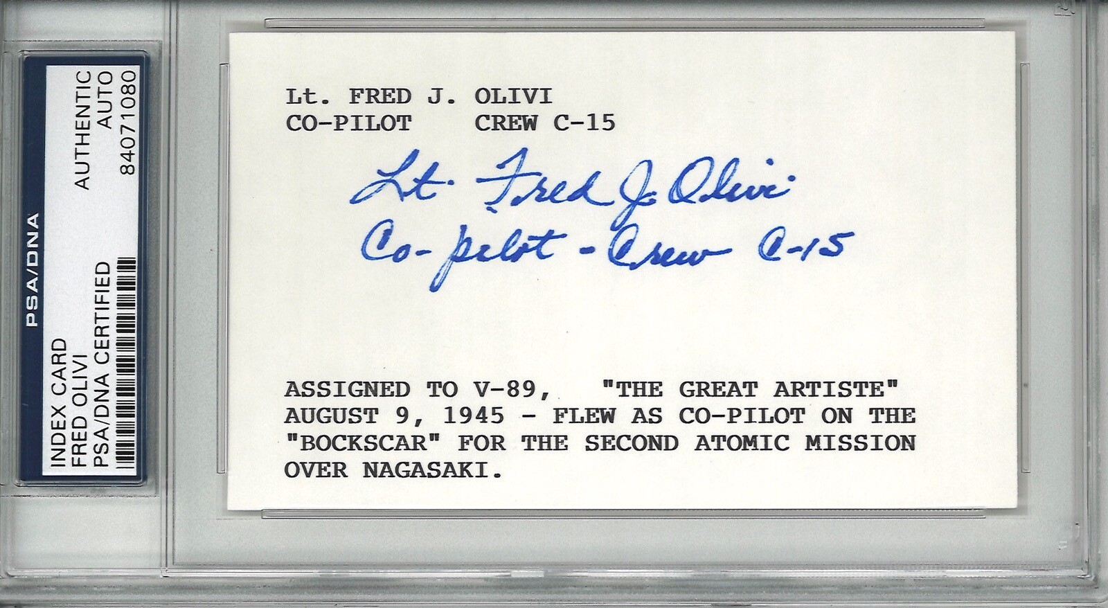 FRED OLIVI SIGNED INDEX CARD PSA DNA 84071080 (D) BOCKSCAR GREAT ARTISTE 8/9/45 COLLECTIBLE MEMORABILIA