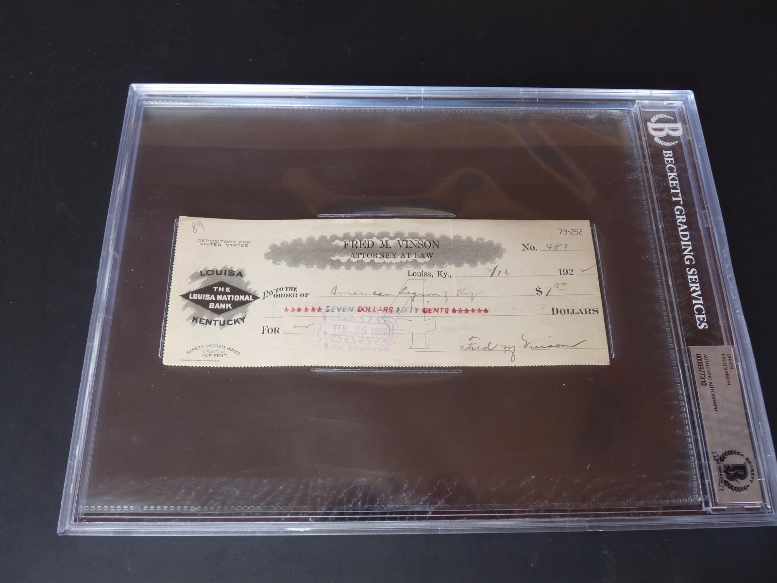 FRED VINSON CHIEF JUSTICE SUPREME COURT SIGNED CHECK BECKETT CERTIFIED SLABBED 4 COLLECTIBLE MEMORABILIA