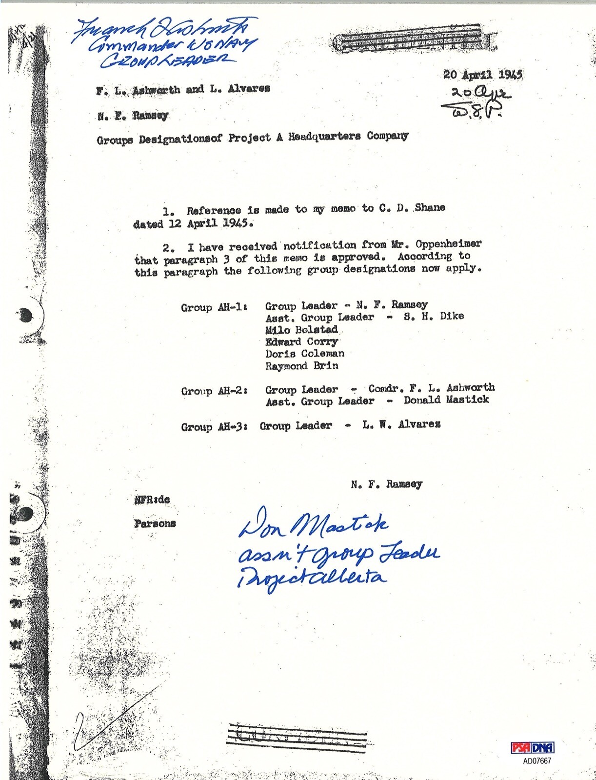 FREDERICK ASHWORTH / DON MASTICK SIGNED PROJECT ALBERTA DOCUMENT PSA DNA AD07667 COLLECTIBLE MEMORABILIA