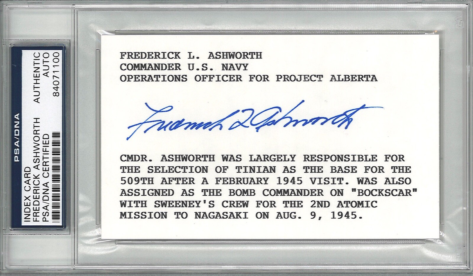 FREDERICK ASHWORTH SIGNED INDEX CARD PSA DNA 84071100 (D) PROJECT ALBERTA COLLECTIBLE MEMORABILIA