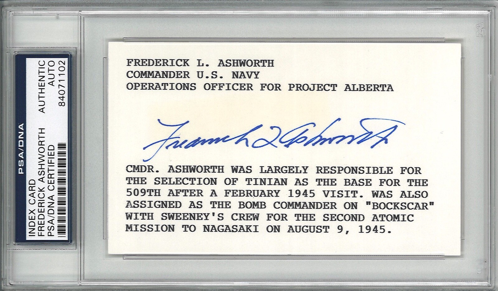 FREDERICK ASHWORTH SIGNED INDEX CARD PSA DNA 84071102 (D) PROJECT ALBERTA COLLECTIBLE MEMORABILIA