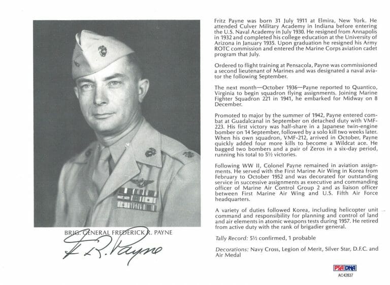 FREDERICK PAYNE SIGNED 8X10 (D) PSA DNA AC42837 WWII ACE 5.5 KILLS COLLECTIBLE MEMORABILIA
