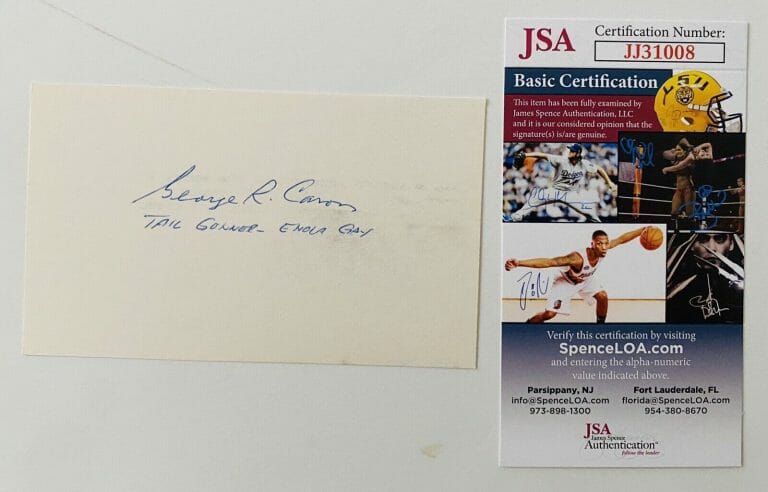 GEORGE CARON SIGNED AUTOGRAPHED 3×5 CARD JSA CERTIFIED ENOLA GAY ATOMIC BOMB COLLECTIBLE MEMORABILIA