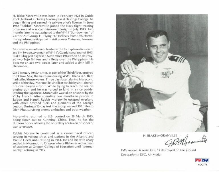 H. BLAKE MORANVILLE SIGNED 8X10 (D) PSA DNA AC42774 WWII ACE 6 KILLS COLLECTIBLE MEMORABILIA