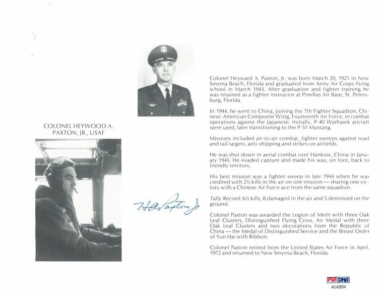 HEYWOOD PAXTON JR SIGNED 8X10 (D) PSA DNA AC42834 WWII ACE 6.5 KILLS COLLECTIBLE MEMORABILIA