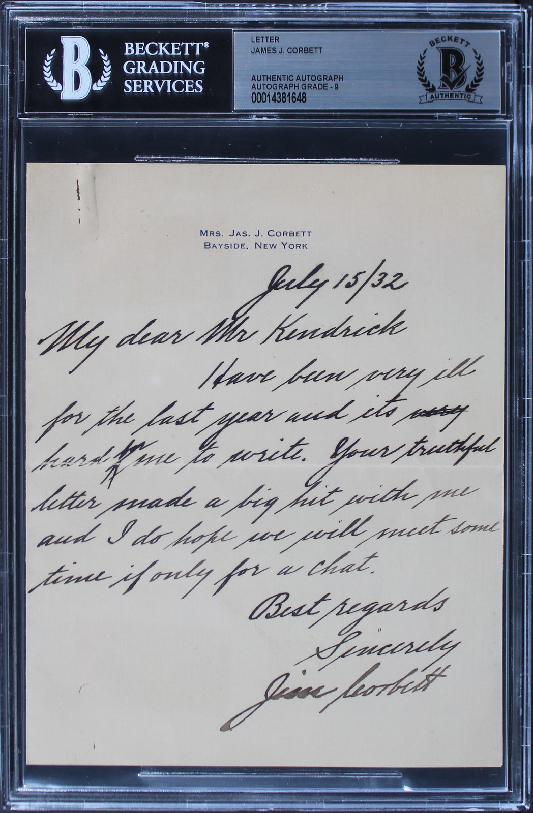 JAMES J. CORBETT SIGNED 5.5×6.75 1932 HANDWRITTEN LETTER AUTO 9! BAS SLABBED COLLECTIBLE MEMORABILIA