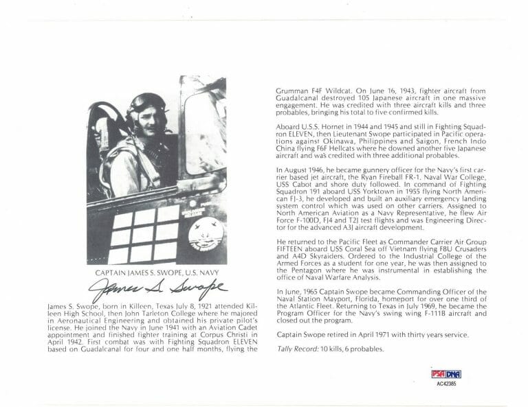 JAMES SWOPE SIGNED 8X10 (D) PSA DNA AC42385 WWII ACE 10 KILLS COLLECTIBLE MEMORABILIA