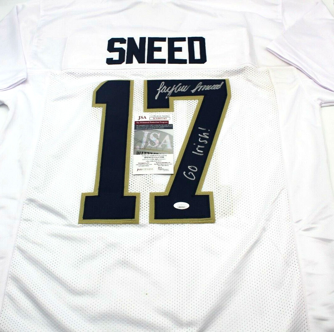 JAYLEN SNEED SIGNED CUSTOM WHITE NOTRE DAME FOOTBALL JERSEY W/JSA COA PROOF #2 COLLECTIBLE MEMORABILIA
