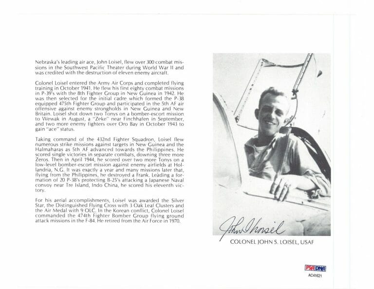 JOHN LOISEL SIGNED 8X10 (D) PSA DNA AC41621 WWII ACE 11 KILLS COLLECTIBLE MEMORABILIA