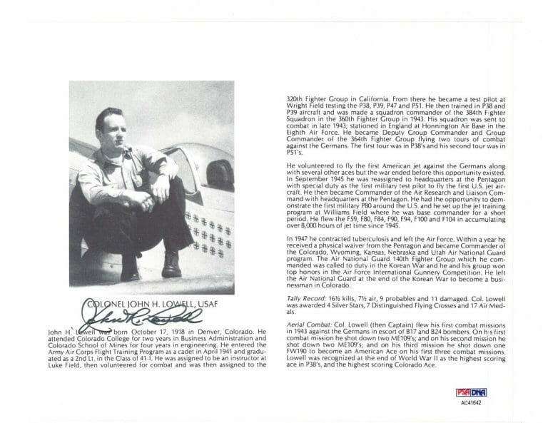 JOHN LOWELL SIGNED 8X10 (D) PSA DNA AC41642 WWII ACE 16.5 KILLS COLLECTIBLE MEMORABILIA