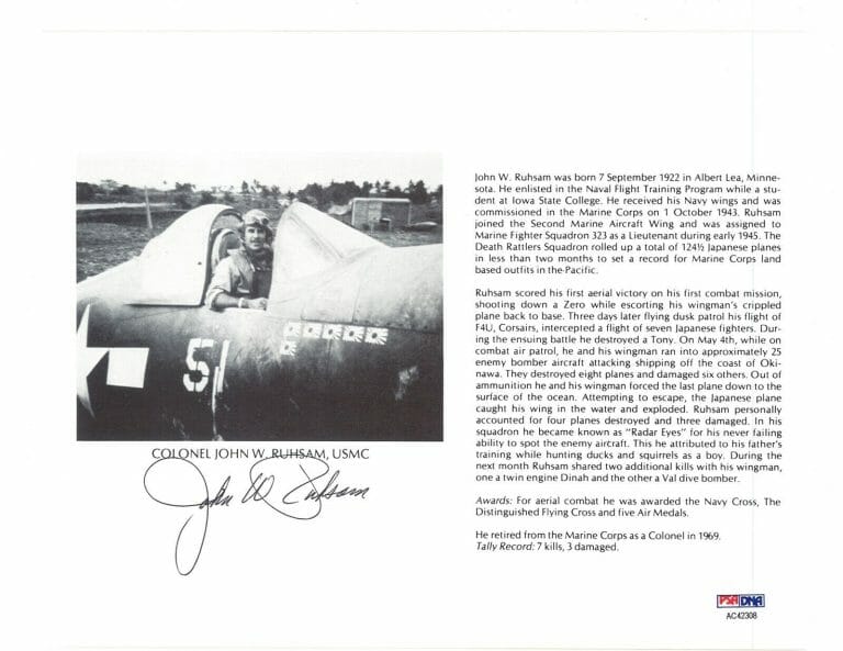 JOHN RUHSAM SIGNED 8X10 (D) PSA DNA AC42308 WWII ACE 7 KILLS COLLECTIBLE MEMORABILIA