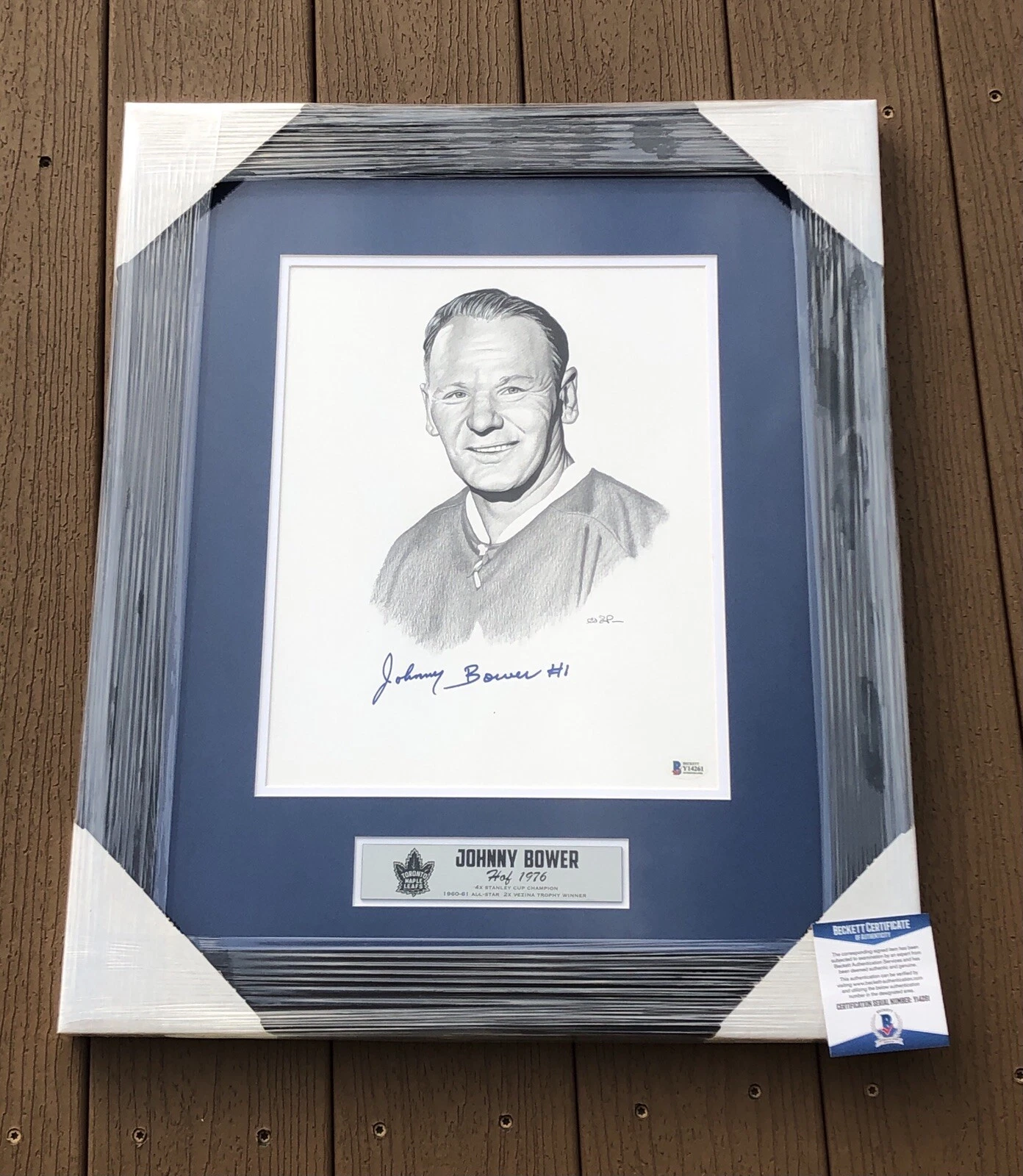 JOHNNY BOWER SIGNED TORONTO MAPLE LEAFS FRAMED MATTED PENCIL SKETCH BECKETT COA COLLECTIBLE MEMORABILIA