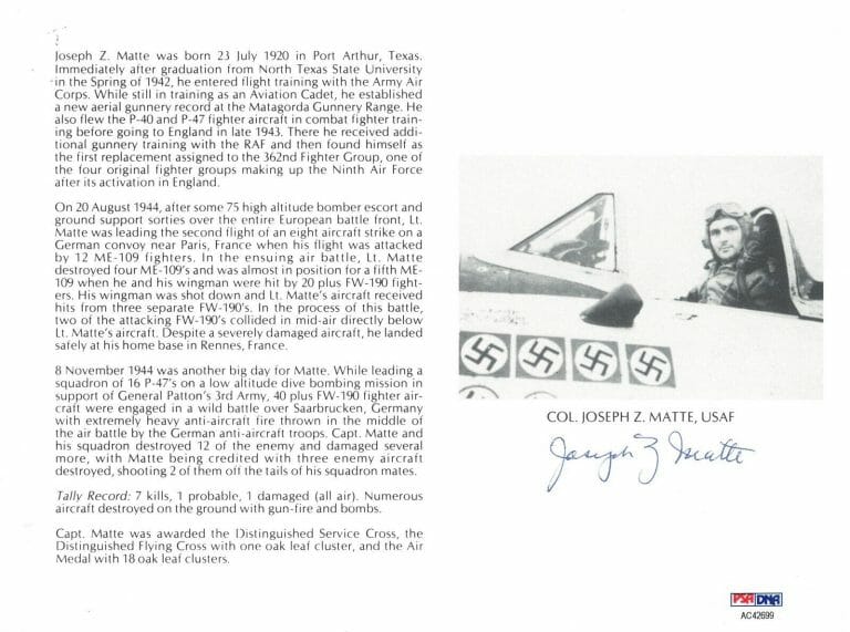JOSEPH MATTE SIGNED 8X10 (D) PSA DNA AC42699 WWII ACE 7 KILLS COLLECTIBLE MEMORABILIA