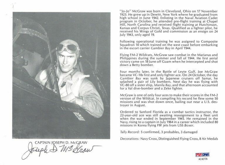 JOSEPH MCGRAW SIGNED 8X10 PSA DNA AC42735 (D) WWII WAR ACE 5 KILLS USN COLLECTIBLE MEMORABILIA