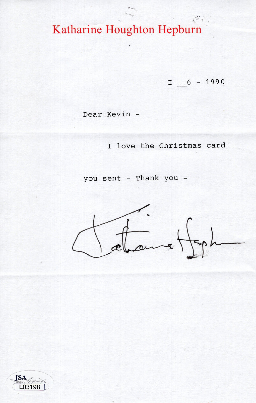 KATHARINE HEPBURN SIGNED LETTER ON LETTERHEAD LOVE THE CARD TO KEVIN JSA COLLECTIBLE MEMORABILIA
