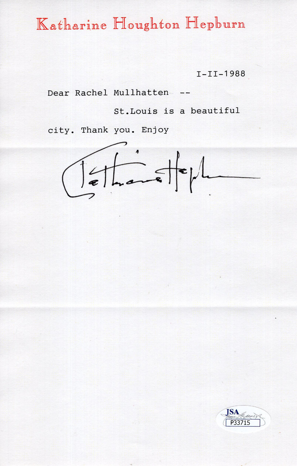 KATHARINE HEPBURN SIGNED LETTER ON LETTERHEAD ST LOUIS IS BEAUTIFUL JSA COLLECTIBLE MEMORABILIA