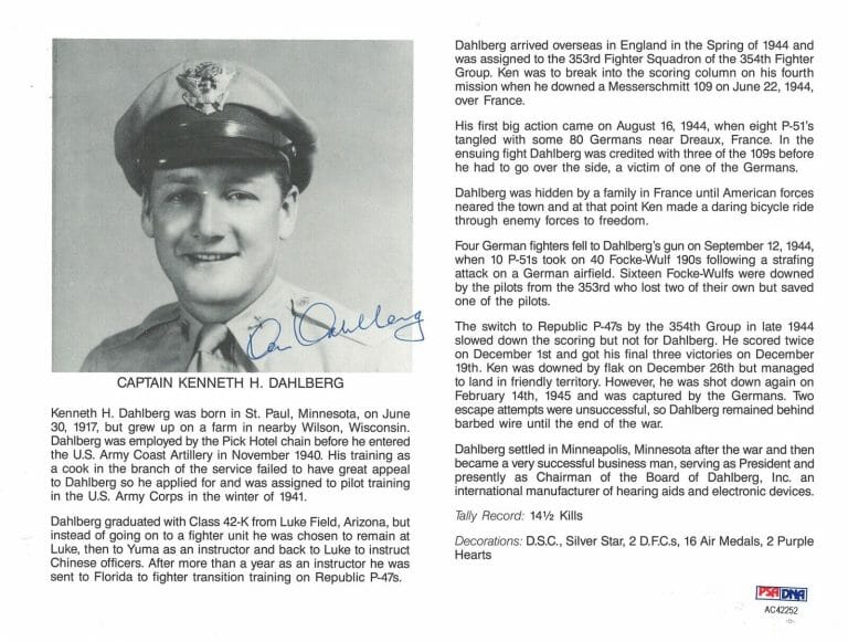 KEN DAHLBERG SIGNED 8X10 (D) PSA DNA AC42252 WWII ACE 14.5V COLLECTIBLE MEMORABILIA