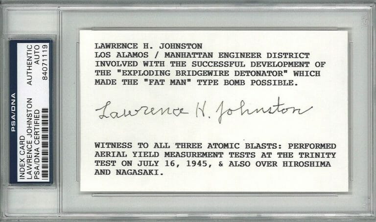 LAWRENCE JOHNSTON SIGNED INDEX CARD PSA DNA 84071119 (D) LOS ALAMOS RARE AUTO COLLECTIBLE MEMORABILIA