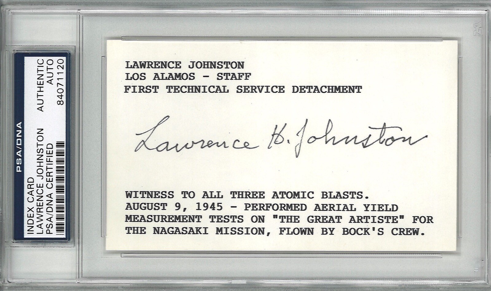 LAWRENCE JOHNSTON SIGNED INDEX CARD PSA DNA 84071120 (D) LOS ALAMOS RARE AUTO COLLECTIBLE MEMORABILIA