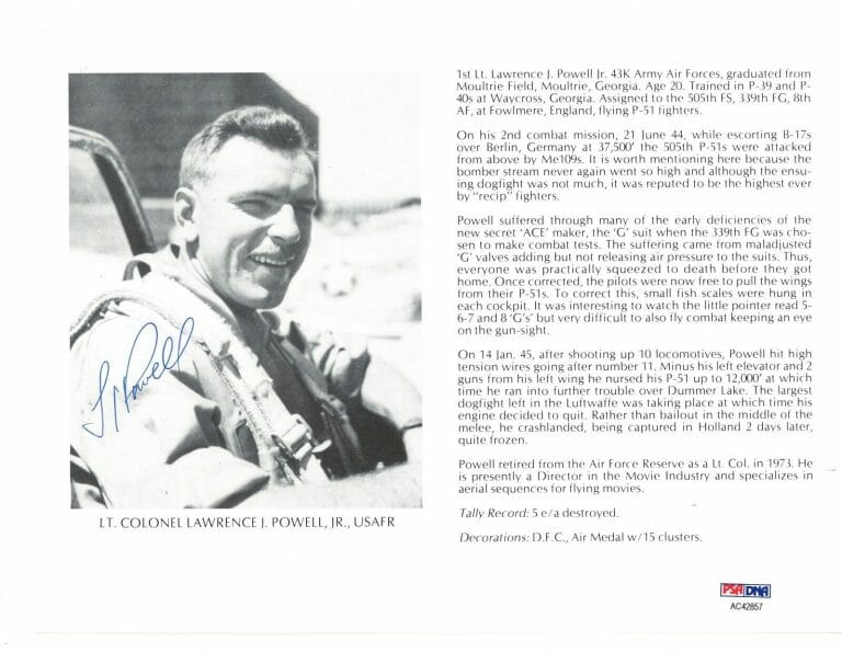 LAWRENCE POWELL JR SIGNED 8X10 (D) PSA DNA AC42857 WWII ACE 5 KILLS COLLECTIBLE MEMORABILIA