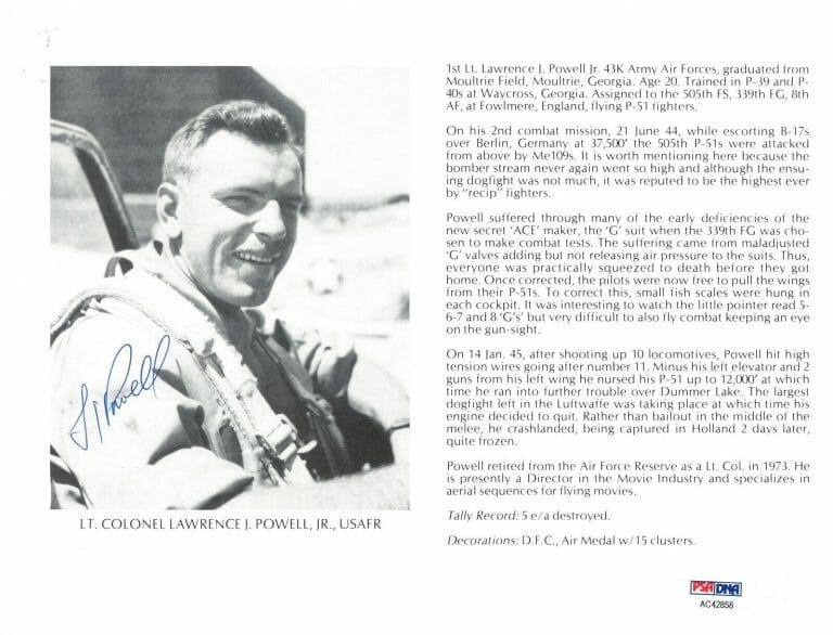 LAWRENCE POWELL JR SIGNED 8X10 (D) PSA DNA AC42858 WWII ACE 5 KILLS COLLECTIBLE MEMORABILIA