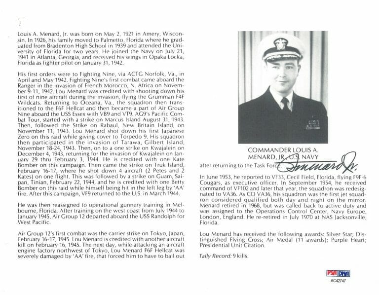 LOUIS MENARD JR SIGNED 8X10 (D) PSA DNA AC42747 WWII ACE 9 KILLS COLLECTIBLE MEMORABILIA