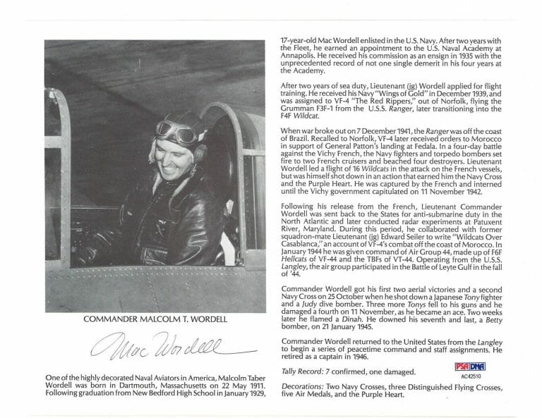 MALCOM WORDELL SIGNED 8X10 (D) PSA DNA AC42510 WWII ACE 7 KILLS COLLECTIBLE MEMORABILIA