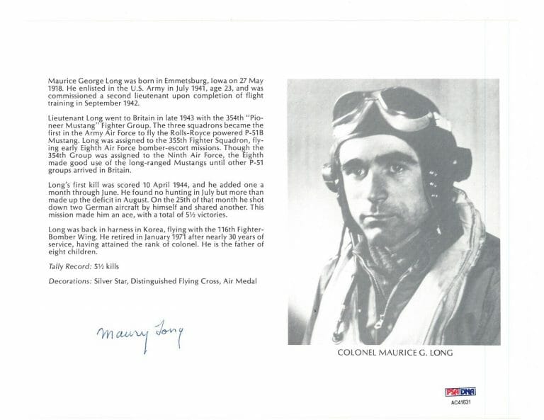 MAURICE LONG SIGNED 8X10 (D) PSA DNA AC41631 WWII ACE 5.5 KILLS COLLECTIBLE MEMORABILIA