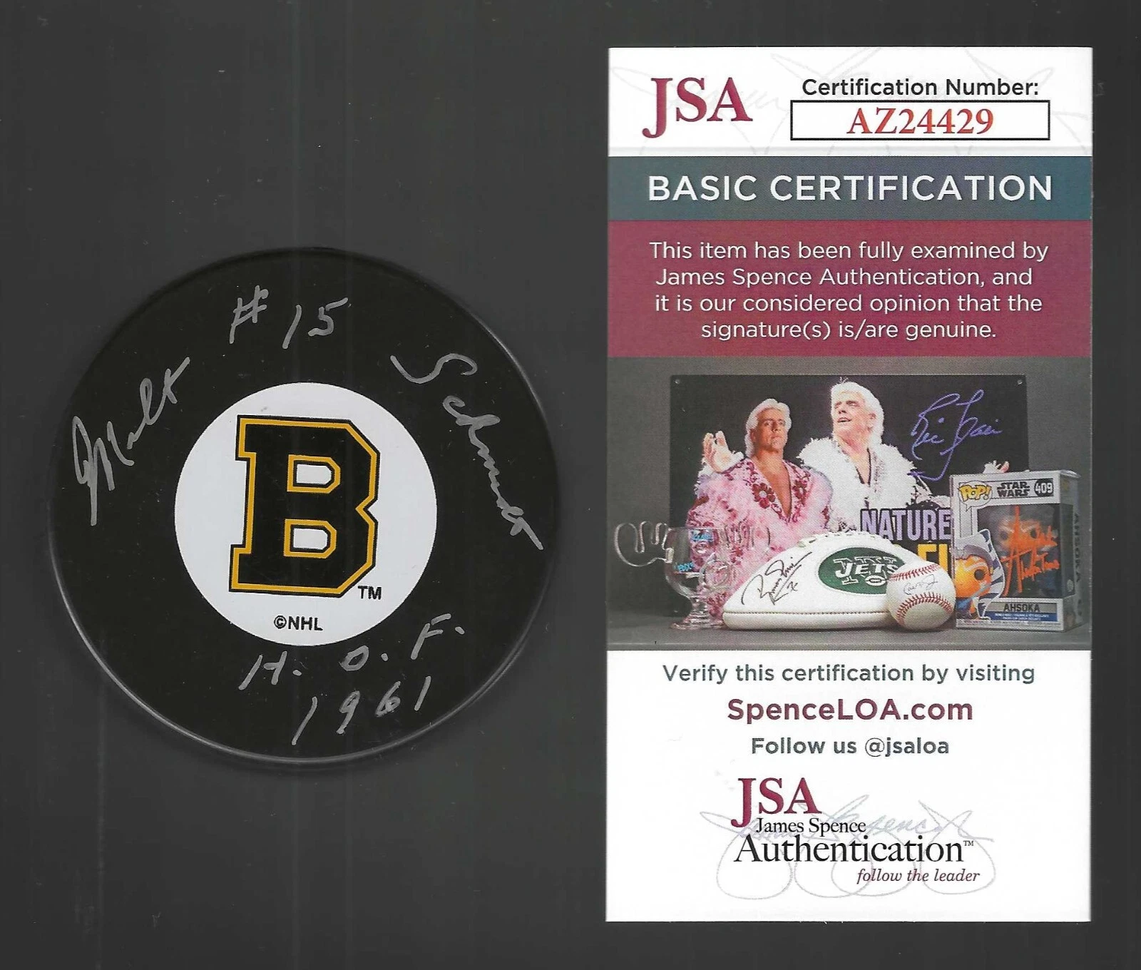 MILT SCHMIDT SIGNED & INSCRIBED BOSTON BRUINS VINTAGE LOGO PUCK JSA COA COLLECTIBLE MEMORABILIA