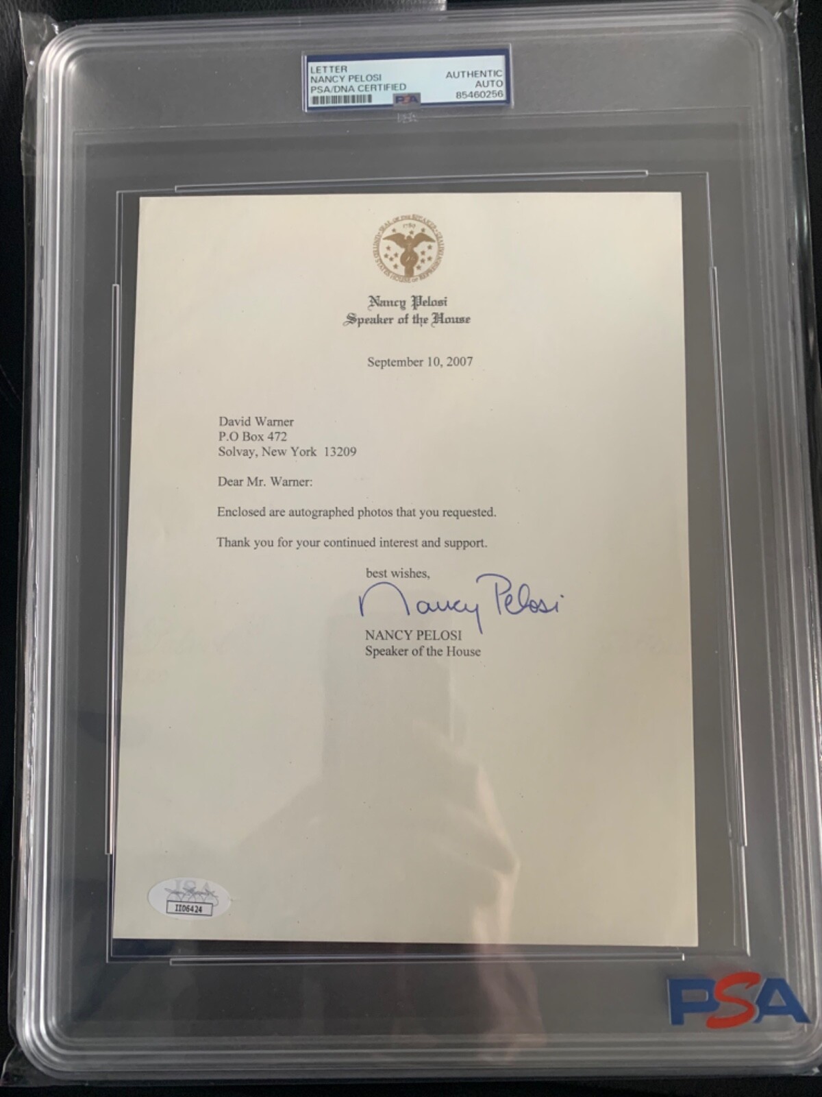 NANCY PELOSI HAND SIGNED LETTER SPEAKER OF HOUSE JSA+PSA SLABBED COLLECTIBLE MEMORABILIA